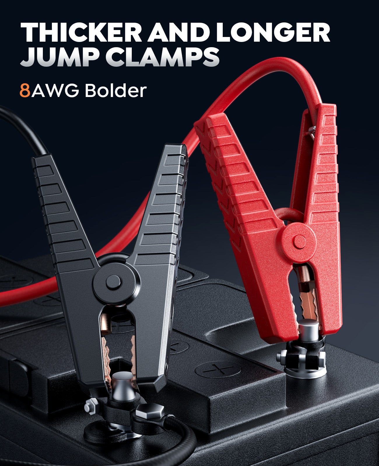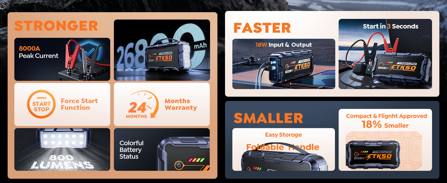 - 【STRONGER, FASTER, SMALLER】This car jump starter delivers an 8000A peak current and FORCE START function for dual protection. It starts all gas and 12.0L diesel engines within seconds, even in extreme temperatures from -4°F to 140°F. 8AWG thicker jumper cables provide superior conductivity. Its compact design is 18% smaller than traditional models, making it easy to store in your glove box or travel bag —so you can travel light and stay prepared.