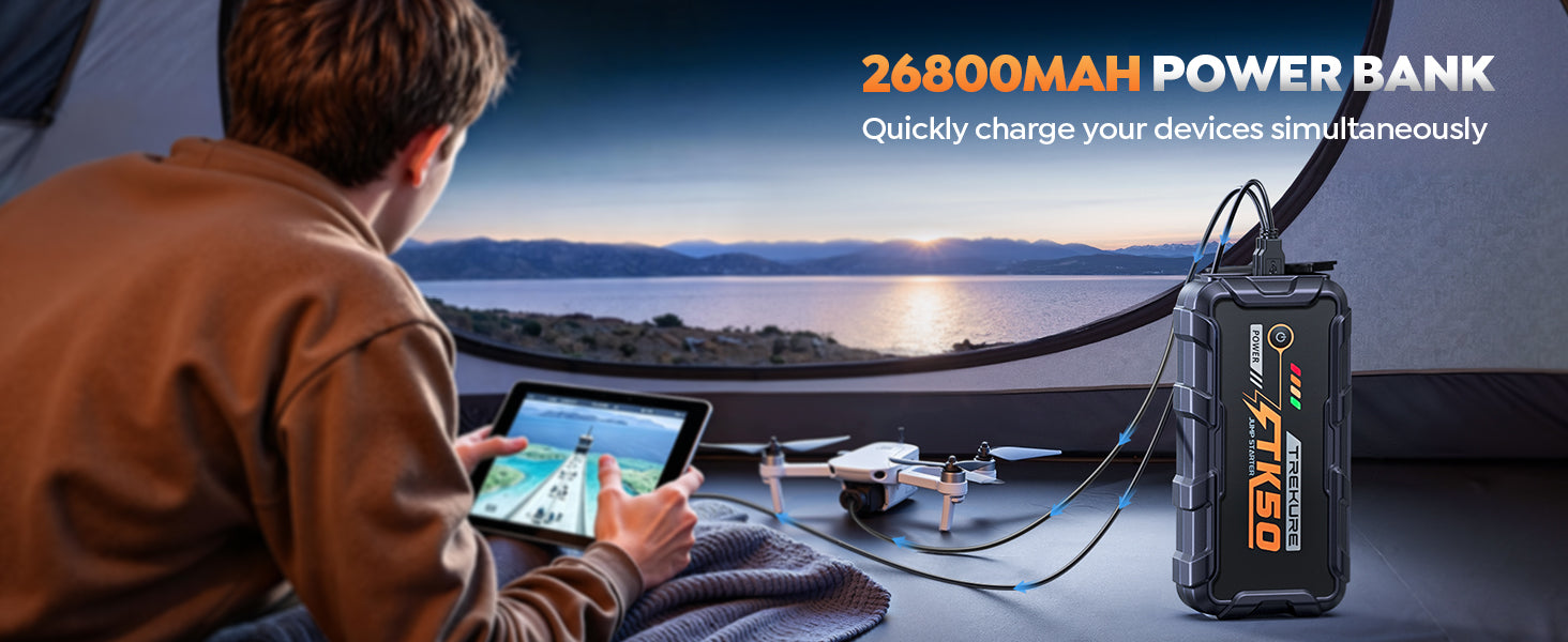 - 【26800mAh & 18W FAST CHARGING】Ideal for travel and emergencies— This 26800mAh portable jump starter features an 18W USB port for up to 75% faster charging. Widely compatible, it easily charges your phone, tablet, earphones, and drone. A built-in smart chip ensures safe and reliable charging for small devices. Delivers multiple starts per charge, up to 24 months of standby, and supports 1000+ recharge cycles.