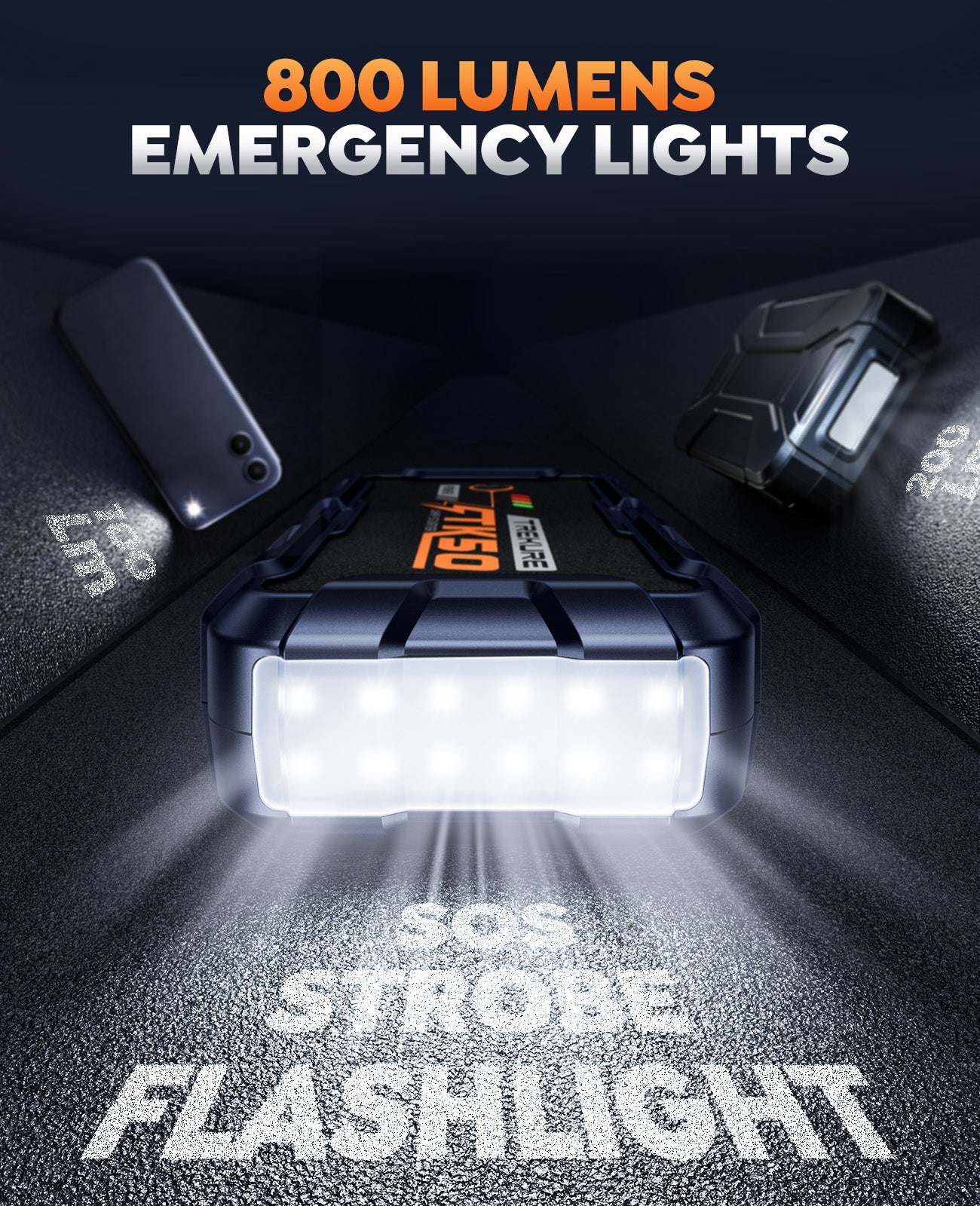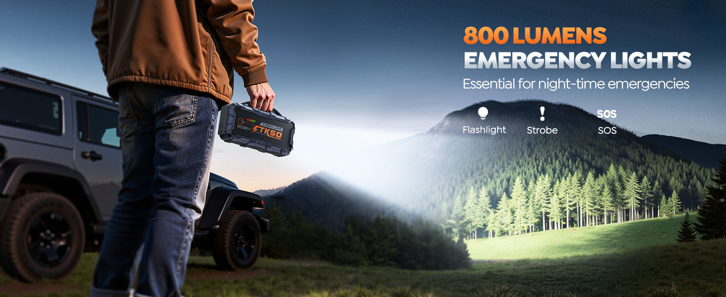 - 【800 LUMENS LIGHT & PORTABLE HANDLE】Equipped with three high-brightness lighting modes—steady light for everyday illumination, strobe for emergency warnings, and SOS for distress signaling. Its large-capacity battery provides over 12 hours of lighting. This car jump starter features a built-in handle for easy grip and portability, making it ideal for nighttime repairs, emergency alerts, daily commutes, road trips, and outdoor adventures.