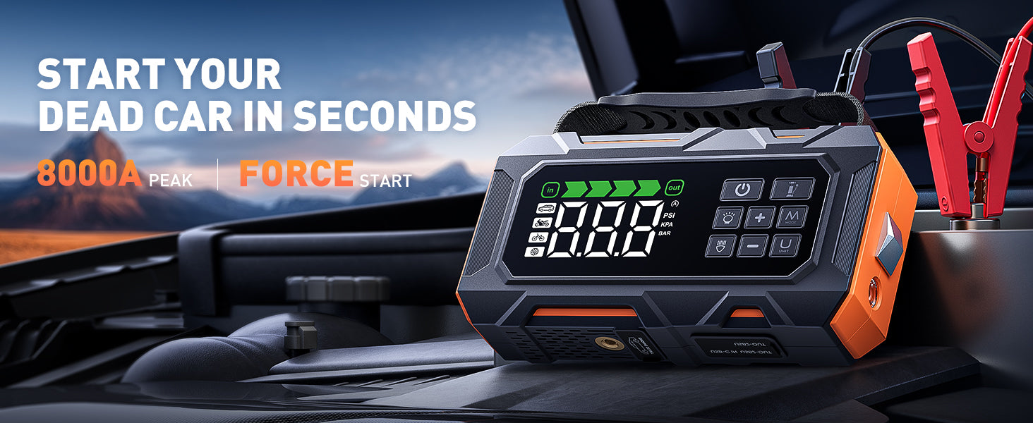 - 【START COMPLETELY DEAD BATTERIES】This car jump starter delivers 8000A peak current and FORCE START function for dual protection. It starts all gas engines and 12.0L diesel engines within seconds, even in extreme temperatures from -4 °F to 140 °F. Extended car jumper cable has a total length of 21.6 inches from the red clamp to the black clamp, making connection easy. It is faster and more convenient than calling roadside assistance or repairs.