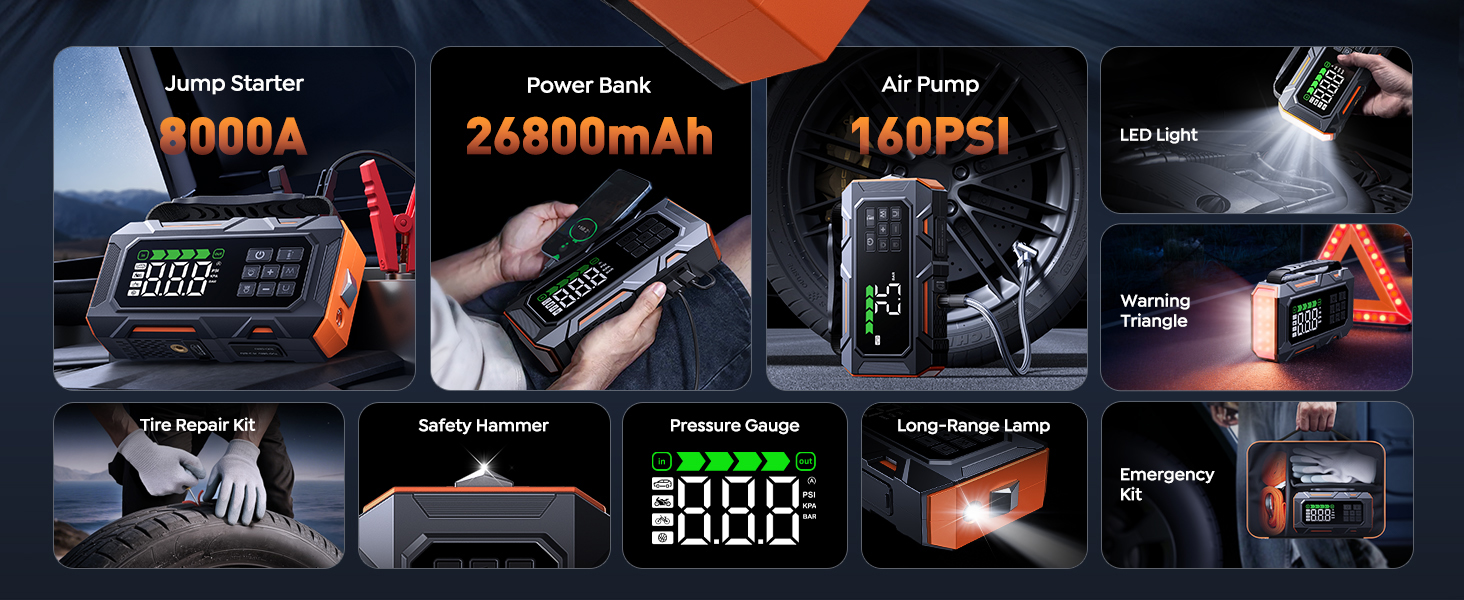 - 【5+4+3 160PSI SMART TYRE INFLATOR】Our car jump starter with air compressor has 5 modes, 4 nozzle attachments and 3 pressure units provide versatility for cars, motorcycles, bikes, sports balls, and more. With preset function, pressure detection, and automatic shut-off, this jump starter with tyre inflator will automatically shut off once it reaches the preset value, no need to babysit the inflation process and worry about overinflation. Plus the tyre repair kit, and 2-IN-1 stone remover hook – your complete roadside tyre solution.